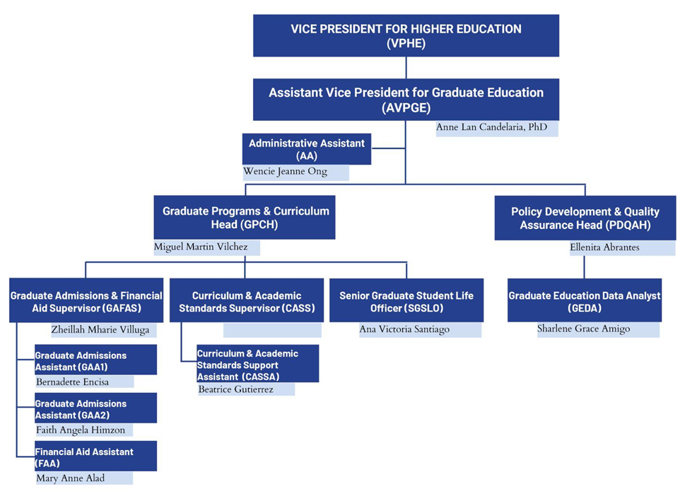 The Office of the AVP for Graduate Education (OAVPGE) is mandated to develop and implement policies and initiatives that advance academic excellence, innovation, and relevance in graduate education in the 9 Higher Education Schools: SOH, GBSEALD, JGSOM, RGLSOSS, SOSE, ASMPH, ALS, AGSB, and ASOG. It also facilitates inter-school collaboration to foster interdisciplinary learning and research, ensure compliance with quality assurance standards and regulatory requirements, and promote a diverse, inclusive, and supportive environment that empowers the graduate student community to thrive academically and professionally.