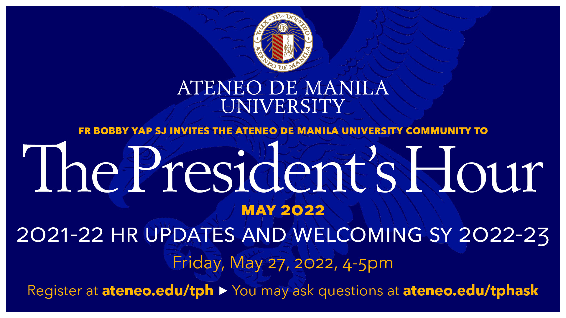 In this session of The President's Hour, Fr Bobby will give HR-related updates for 2021-2022 and will discuss the University's plans and updates for the incoming SY 2022-2023.