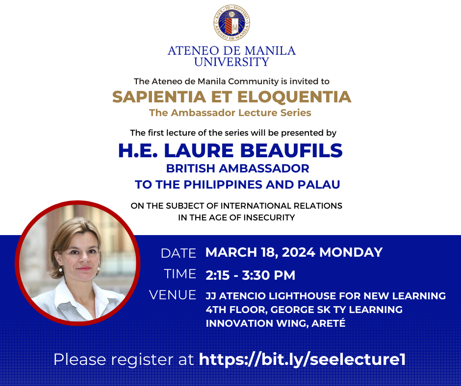 The Ateneo de Manila Community is invited to the first Sapienta et Eloquentia: The Ambassador Lecture Series to be presented by Her Excellency Laure Beaufils, British Ambassador to the Philippines and Palau.