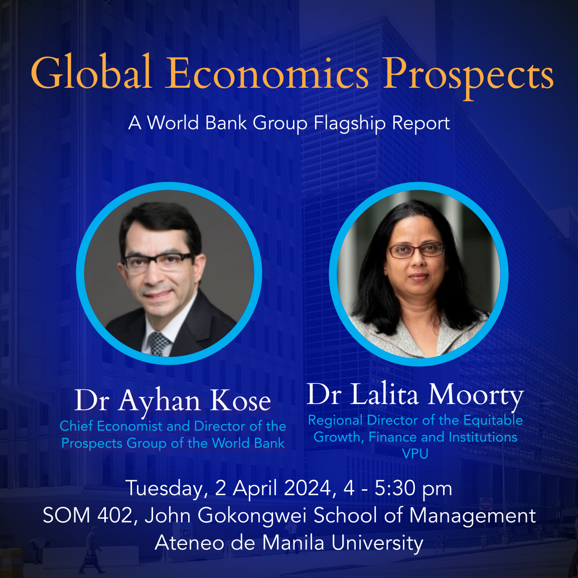 Dr Lalita Moorty, Regional Director of the Equitable Growth, Finance and Institutions, and Dr Ayhan Kose, Deputy Chief Economist and Director of the Prospects Group of the World Bank will be speaking at Ateneo de Manila University on Tuesday, 2 April 2024 at SOM 402, John Gokongwei School of Management Building, from 4:00 PM to 5:30 PM. Dr Moorty will moderate a session in which Dr Kose will present the latest Global Economic Prospects Report. In particular, he will discuss current economic conditions globally and the implications for the region and the Philippines, and present a special focus chapter on investment accelerations, what they mean for key economic outcomes and what are the key enabling factors, based on a cross-country analysis spanning the period 1980-2020. Dr Kose is one of the lead authors of the World Bank’s recently released Global Economic Prospects (GEP) report for January 2024 which examines growth trends for the global economy and how they affect developing countries. Everyone is invited!