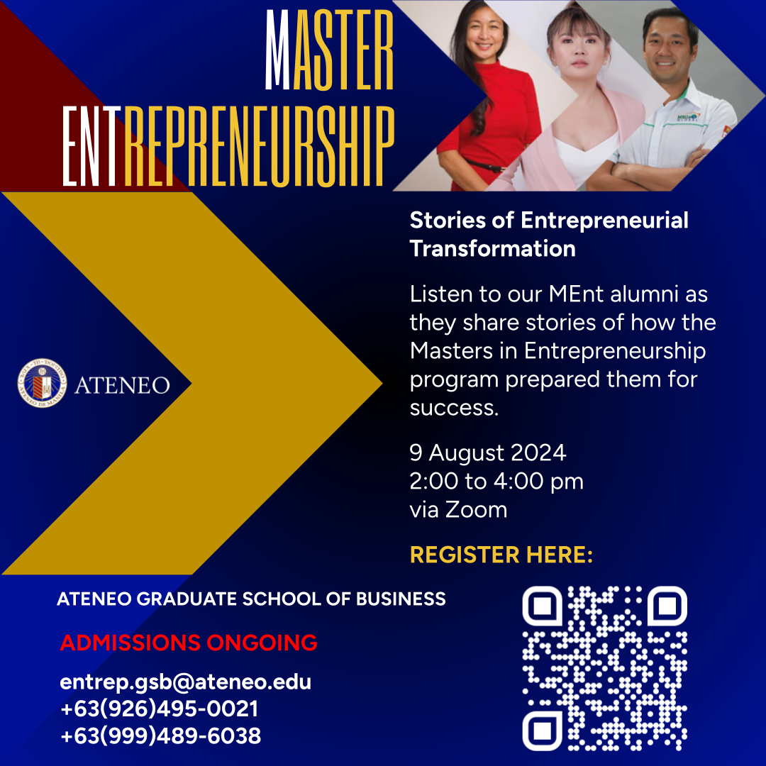 Join us in this online kamustahan featuring our MEnt alumni who went above and beyond their entrepreneurial calling as they prove that if one wants change, it always starts with the mastery of the self, the enterprise and the environment – the three masteries taught in the Master in Entrepreneurship program. Listen as they share stories of their entrepreneurial pursuits that shaped their entrepreneurial mindframe and strengthened their entrepreneurial heartflame that enabled them to withstood the tough entrepreneurial gut game.