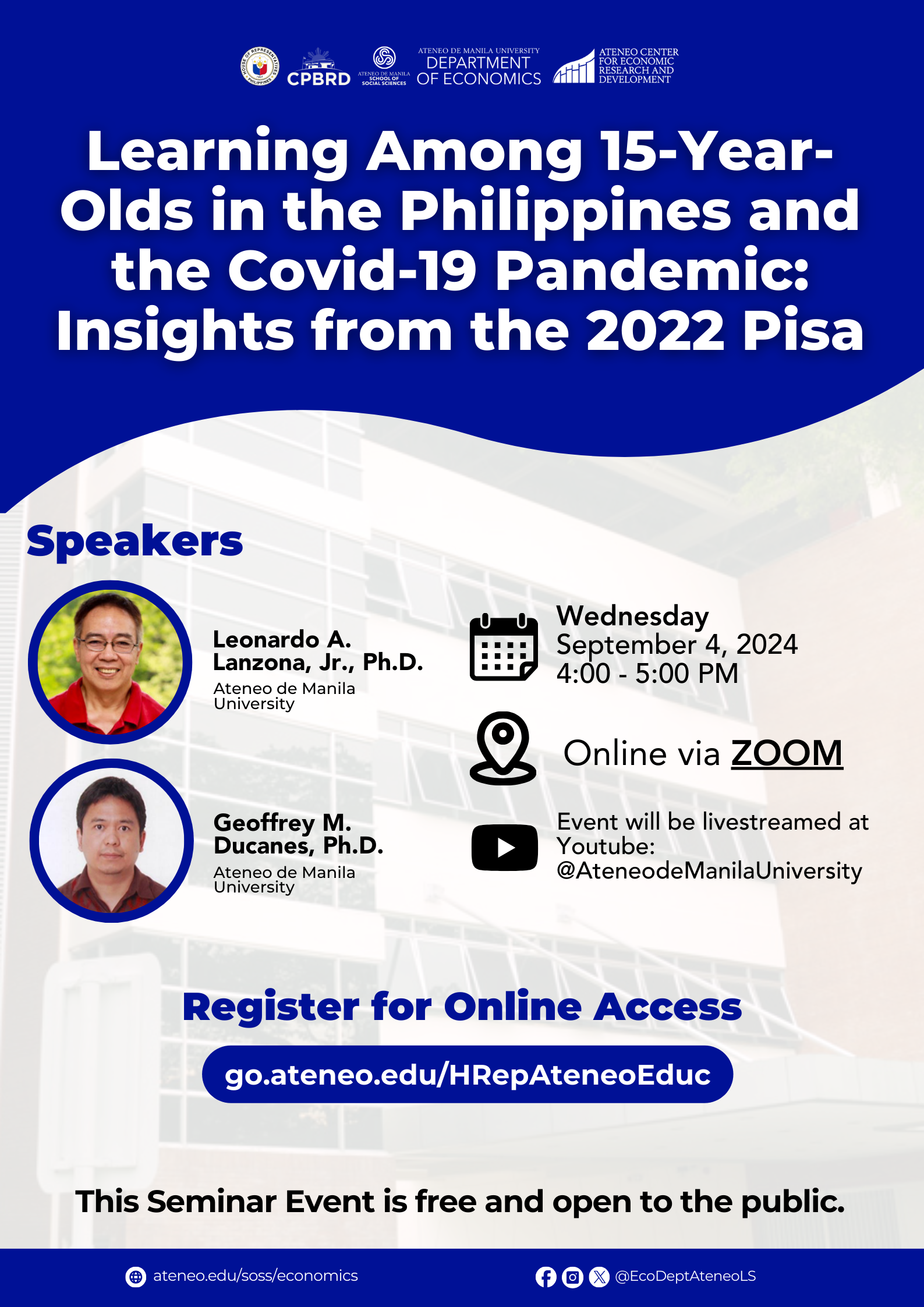 Geoffrey Ducanes, an Associate Professor at the Ateneo de Manila University Department of Economics and a recipient of the 2014 Outstanding Young Scientist award in Economics, and Leonardo A. Lanzona Jr., a Professor of Economics at the same university with a PhD from the University of the Philippines and postdoctoral studies at Yale University, authored a study titled "Learning Among 15-Year-Olds in the Philippines and the Covid-19 Pandemic: Insights from the 2022 PISA." The study analyzes the impact of the COVID-19 pandemic on the learning outcomes of 15-year-olds in the Philippines using data from the 2022 and 2018 PISA assessments. The findings indicate significant and heterogeneous learning losses, particularly among males, public school students, and those without access to digital devices or real-time lessons during the pandemic. The study emphasizes the need for targeted remedial interventions to address these disparities and improve the overall proficiency of Filipino students.