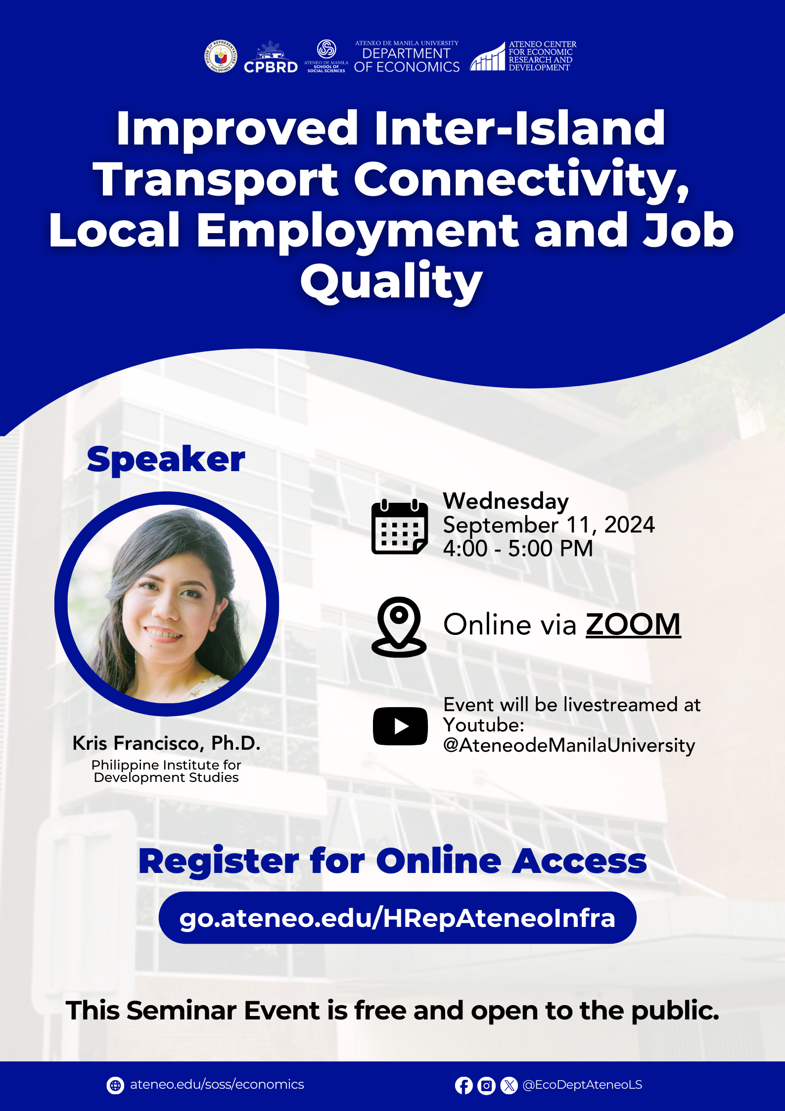 Dr. Kris Francisco, a Research Fellow at the Philippine Institute for Development Studies (PIDS), specializes in development economics, applied econometric analysis, and transportation economics. She previously served as an Associate Professor at De La Salle University School of Economics and has consulted for the Department of Trade and Industry, as well as the Asian Development Bank Institute in Tokyo, Japan. Holding a PhD in Public Economics from the National Graduate Research Institute for Policy Studies in Tokyo, Dr. Francisco's latest paper, Improved Inter-Island Transport Connectivity, Local Employment, and Job Quality, examines the impact of the Roll-on/Roll-off (RORO) policy on local employment and job quality in the Philippines. Using a difference-in-differences approach, the study compares employment outcomes in municipalities with RORO ports to those without, revealing that female workers with middle and high skill levels benefited significantly, particularly in the services sector, including finance and insurance industries. This research highlights the role of transport infrastructure improvements in enhancing local employment and job quality.