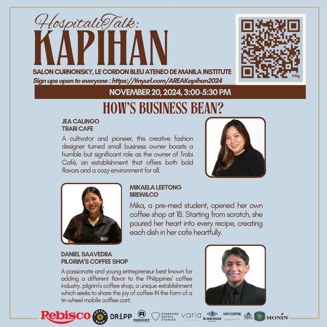 This session takes place from 3:00 to 5:30 pm on 20 November 2024 at Salon Curnonsky, Le Cordon Bleu Ateneo de Manila and will feature guest speakers Jea Calingo of Trabi Cafe Mikaela Leetong of Brew&Co and Daniel Saavedra of Pilgrim's Coffee Shop.