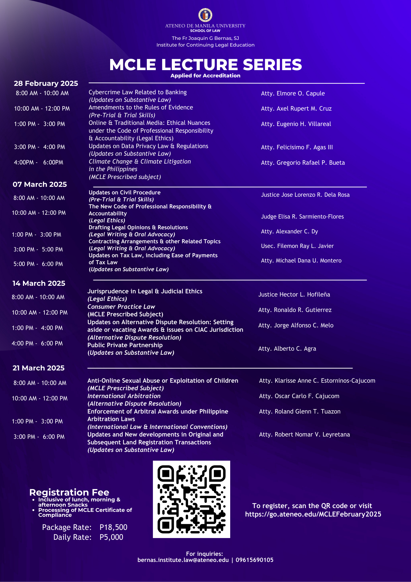 The Ateneo Law School's Fr Joaquin G Bernas SJ. Institute for Continuing Legal Education invites you to the MCLE Lecture Series.