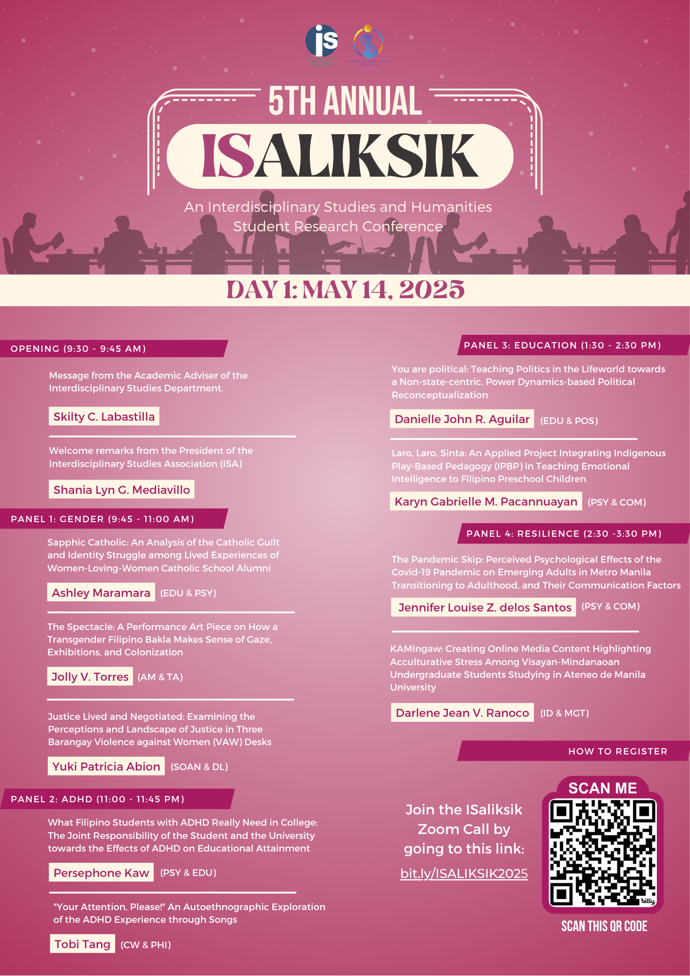The ISALIKSIK Student Research Conference will be held Online via Zoom on May 14-15, 9:30 am - 3:30 pm.