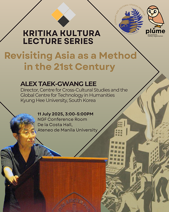 Kritika Kultura, in collaboration with the Literary and Cultural Studies Program and PLUME, invites you to a lecture titled “Revisiting Asia as a Method in the 21st Century,” to be delivered by Alex Taek-Gwang Lee of Kyung Hee University, South Korea. The lecture will take place on 11 July 2025, 3:00–5:00 PM, at the NGF Conference Room, De la Costa Hall, Ateneo de Manila University.