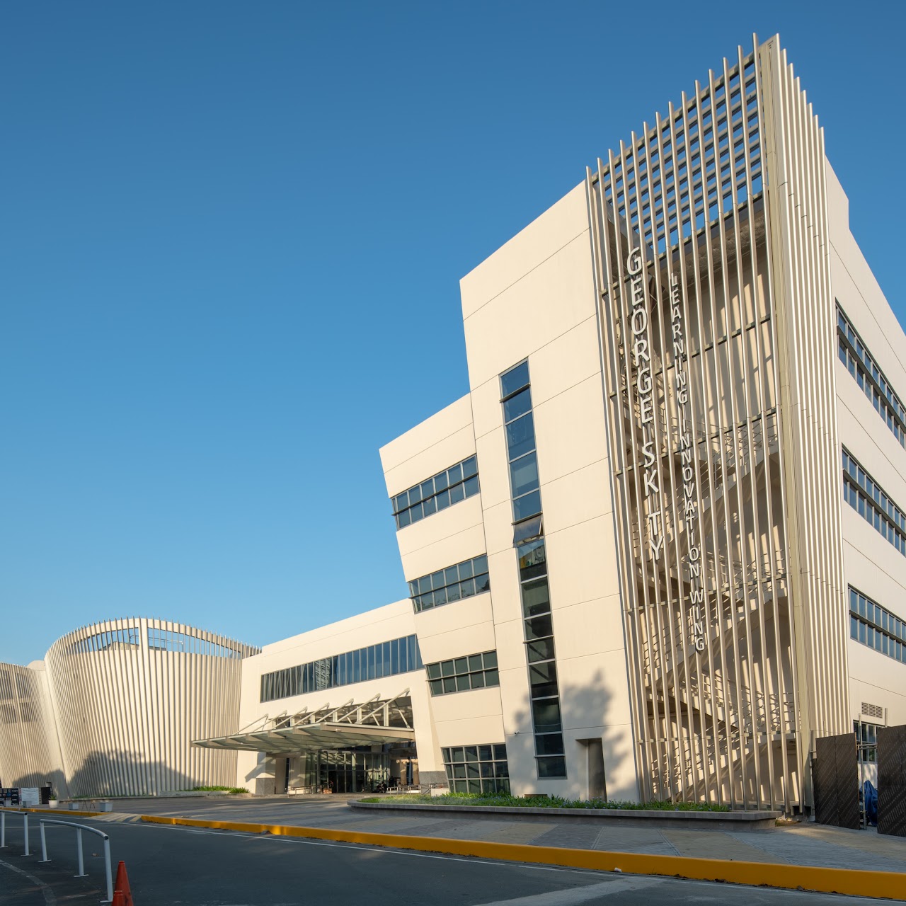 One of the most novel buildings on campus is the Areté. It is a four story building, divided into two wings — the Innovation Wing and the Arts Wing. The entire establishment has an average of 15,504.3 sqm for its total gross floor area, including the Utility Center Building (UCB) and Sewage Treatment Plant (STP). Overall, its structure has features that uphold modernization and sustainability. It is composed of reinforced concrete walls with the covering of an Exterior Insulation and Finish System (EIFS) Half-Therm System Finish. Decorative aluminum fins with anodized finish was also installed and surrounds the entire building envelope. This protects the fixed and awning windows with a reflective blue glass heat strengthened on a powder coated aluminum frame. PVC roof sheet panels were used on the covered part of the building and in its interior finishes, engineered wood planks were used specifically in the Galleries, while a combination of tiled and cement finish lean on the rest of the Arete. The roof structural and framing system is also designed to withstand the weight of the solar panels which are now in place. Arete uses treated and recycled grey water for it's aircon cooling tower. The Hyundai Hall, one of Arete’s main features, was also carpeted with a sound insulation panel on its wall.
