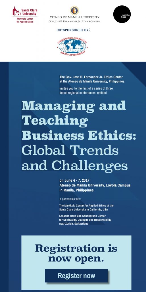 The Gov. Jose B. Fernandez, Jr. Ethics Center of Ateneo de Manila University presents Managing and Teaching Business Ethics: Global Trends and Challenges. The Conference is the first leg of three regional business ethics conferences in Asia, Europe and Africa, and the United States of America and is organized in partnership with The Markkula Center for Applied Ethics (Santa Clara University in California, USA), the Lassalle-Haus Bad Schönbrunn (Zurich, Switzerland) and the International Association of Jesuit Business Schools (IAJBS).