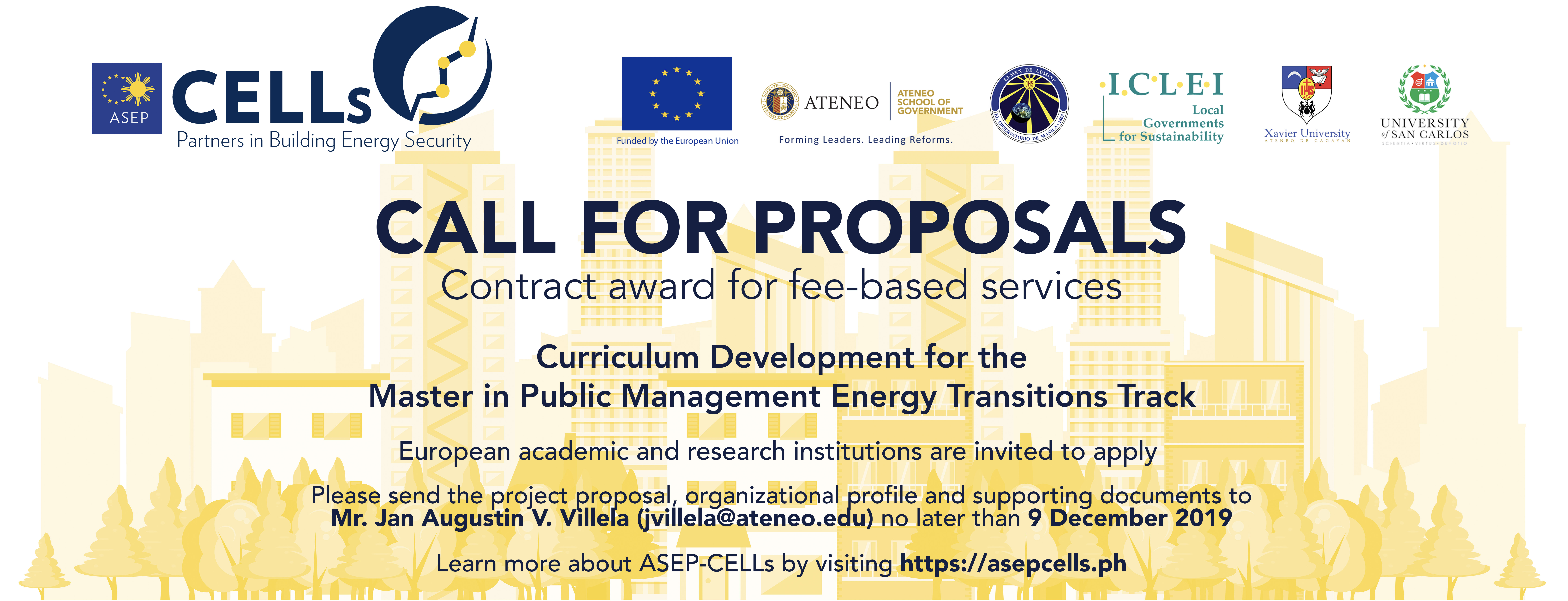 The Ateneo de Manila University, through the Ateneo School of Government, intends to award a contract for fee-based services to carry out curriculum development for the Master in Public Management (MPM) Energy Transitions Track. This contract will be under the project titled “Clean Energy Living Laboratories (CELLs): The development of centers of excellence on energy access, renewable energy, and energy efficiency” currently being implemented by the Ateneo de Manila University, through its School of Government. The general objective of the project is to increase the awareness and knowledge on rural electrification, energy efficiency and renewable energy, through the creation of a national Centre of Excellence for SE4All and SDG7.