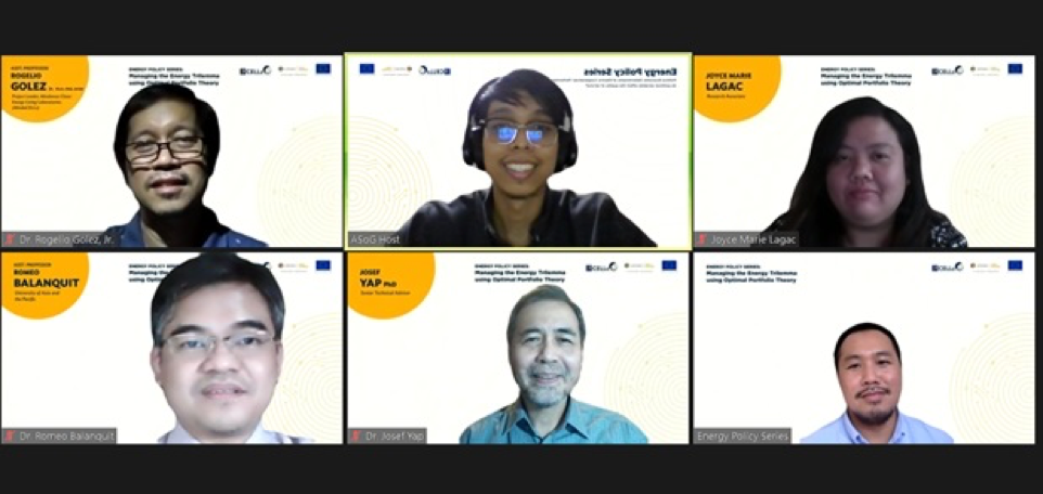 In the webinar, Ms. Joyce Lagac, ASEP-CELLs Research Associate, and Dr. Josef Yap, ASEP-CELLs Senior Technical Advisor, presented their working paper entitled “Managing the Energy Trilemma Using Optimal Portfolio Theory”. Joining them in the panel were Dr. Romeo Balanquit, Assistant Professor at the University of Asia and the Pacific, who served as the reactor, and Dr. Rogelio Golez, Jr., Assistant Professor at the Xavier University - Ateneo de Cagayan, who moderated the open forum.