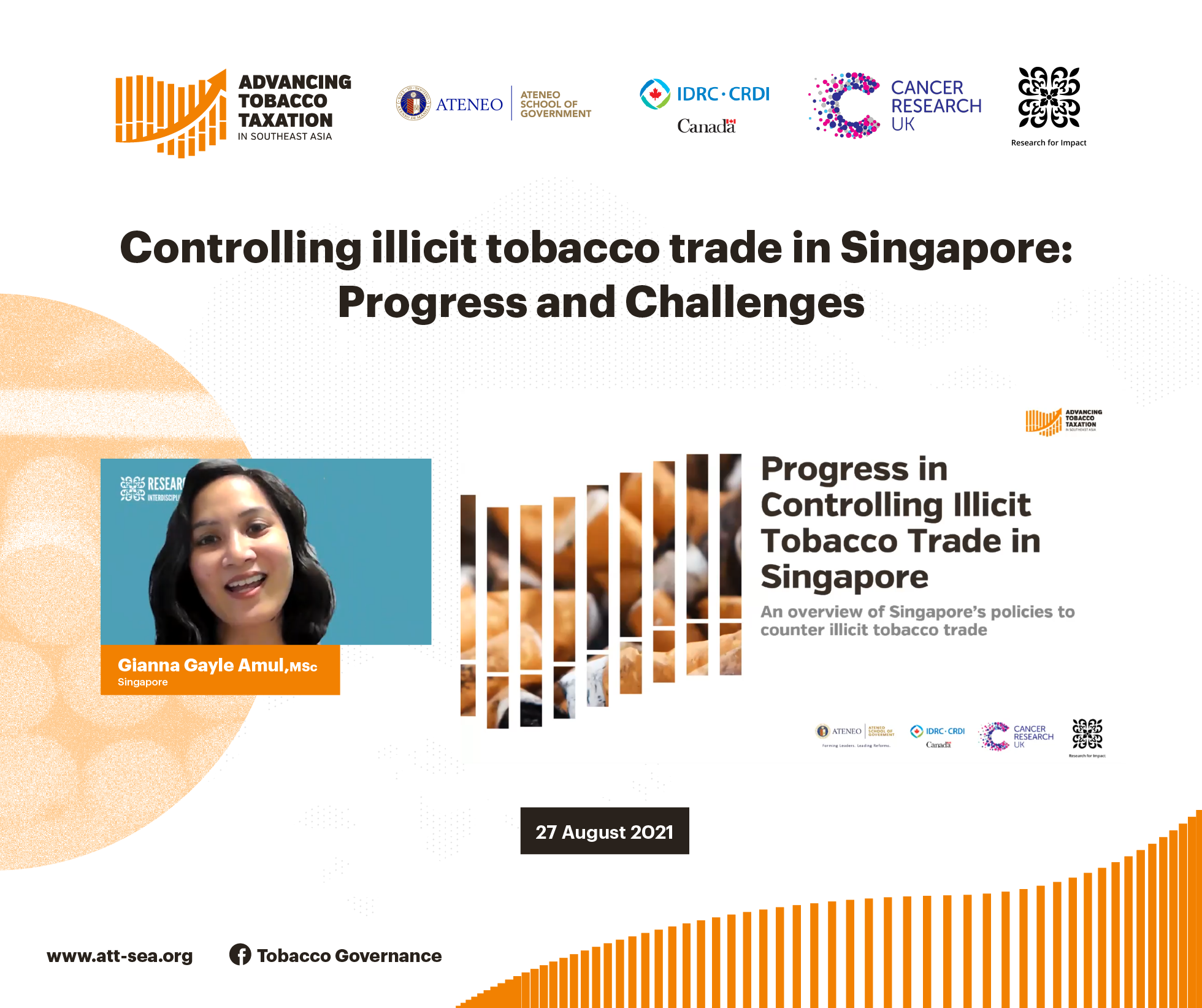 On August 27, 2021, the Ateneo School of Government, through its project Advancing Tobacco Taxation in Southeast Asia (ATTSEA), hosted the third in its series of webinars entitled “Controlling Illicit Tobacco Trade In Singapore: Progress and Challenges” featuring research presentations led by its Singapore-based research fellow, Gianna Gayle Amul. Various stakeholders attended the event, including representatives from Singapore’s Ministries of Health and Finance, as well as allies from the Southeast Asian Tobacco Control Alliance (SEATCA) and Research for Impact (RFI). The ATTSEA initiative is a project receiving financial support from International Development Research Centre (IDRC) - Canada and Cancer Research UK.