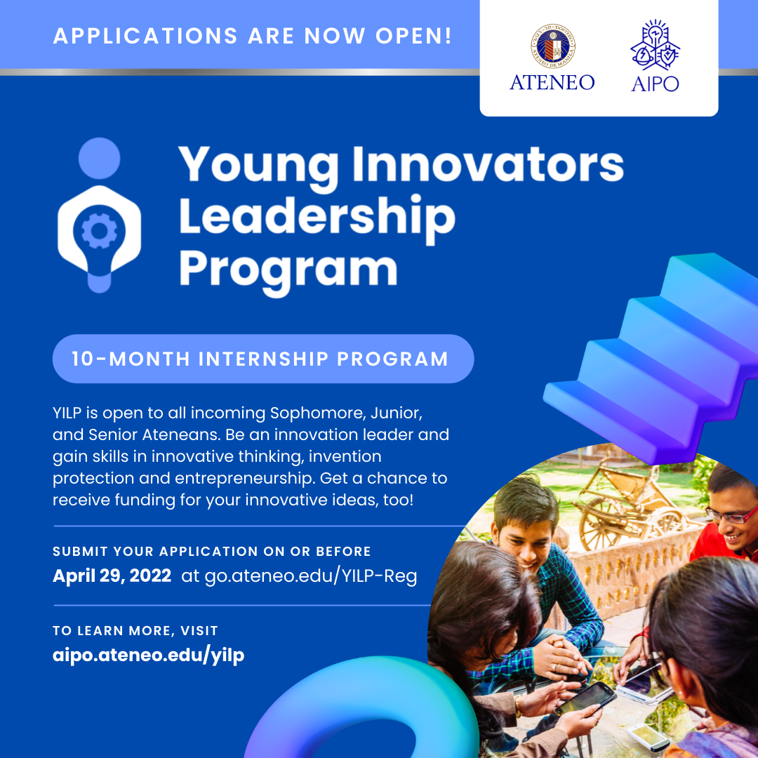 The Ateneo Intellectual Property Office (AIPO) launches today the 2022 Young Innovators Leadership Program (YILP), a 10-month internship program designed to support young potential leaders to gain skills in innovative thinking, invention protection and entrepreneurship. At the end of the internship, interns will be given a chance to present and implement their innovative ideas with the assistance of the AIPO.