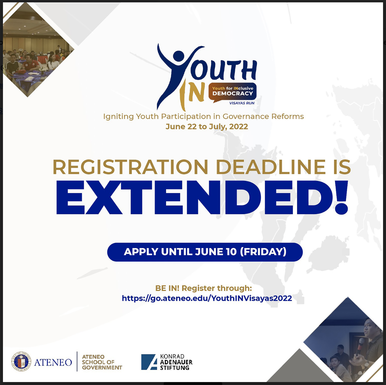 Don't miss this learning opportunity and the chance to engage with other youth leaders. Register now through https://go.ateneo.edu/YouthINVisayas2022 until June 10, 2022 (Friday).