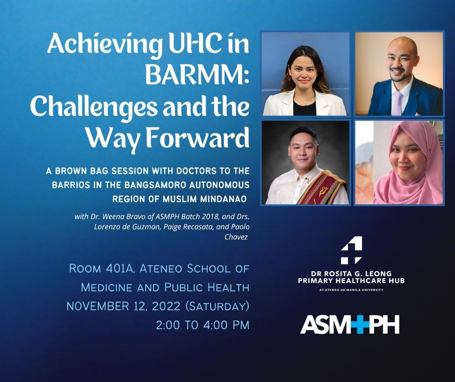 Former Doctors to the Barrio (DTTB) who served in the Bangsamoro Administration Region of Muslim Mindanao (BARMM) shared their experiences at a brownbag session hosted by the ASMPH’s Dr. Rosita G. Leong Hub for Primary Physician Formation on Saturday, November 12, 2022.