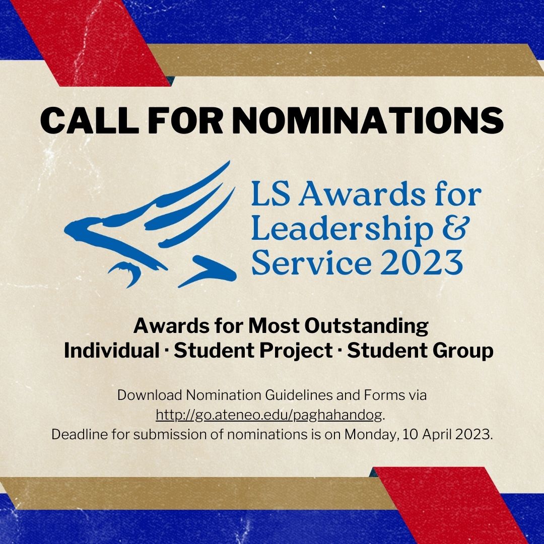 The deadline for submission of nominations is on Monday, 10 April 2023. Kindly submit all duly accomplished Nomination Forms in PDF to the Office of the Assistant Vice President for Student Activities and Leadership Formation through the email address: salf@ateneo.edu.