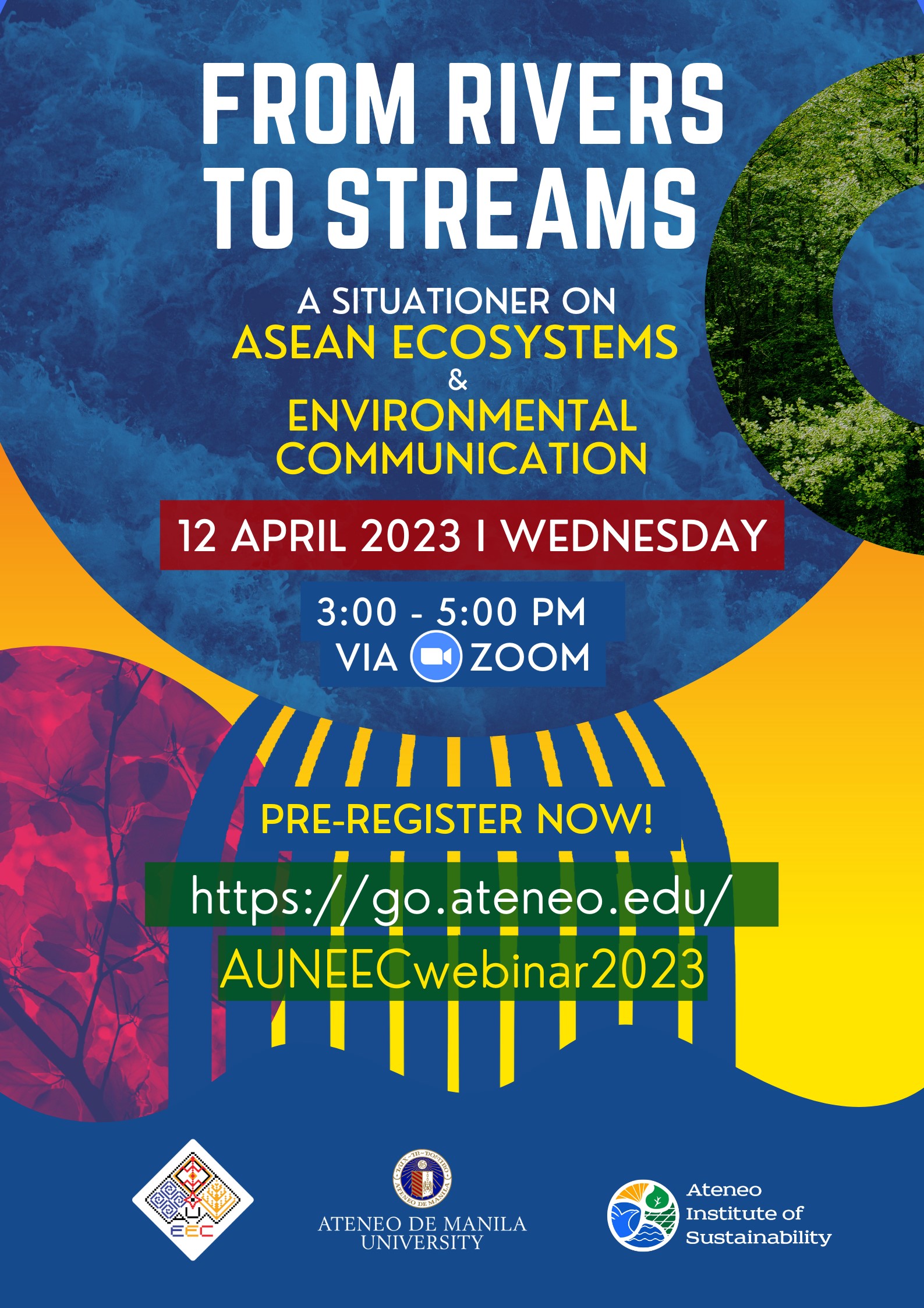 Housed at the Ateneo Institute of Sustainability, the ASEAN University Network on Ecological Education and Culture (AUN-EEC) is organizing a webinar entitled “From Rivers to Streams: A Situationer on ASEAN Ecosystems and Environmental Communication”. The free webinar aims to raise awareness on the current state of our environment and how this current state is being discussed in the public sphere.