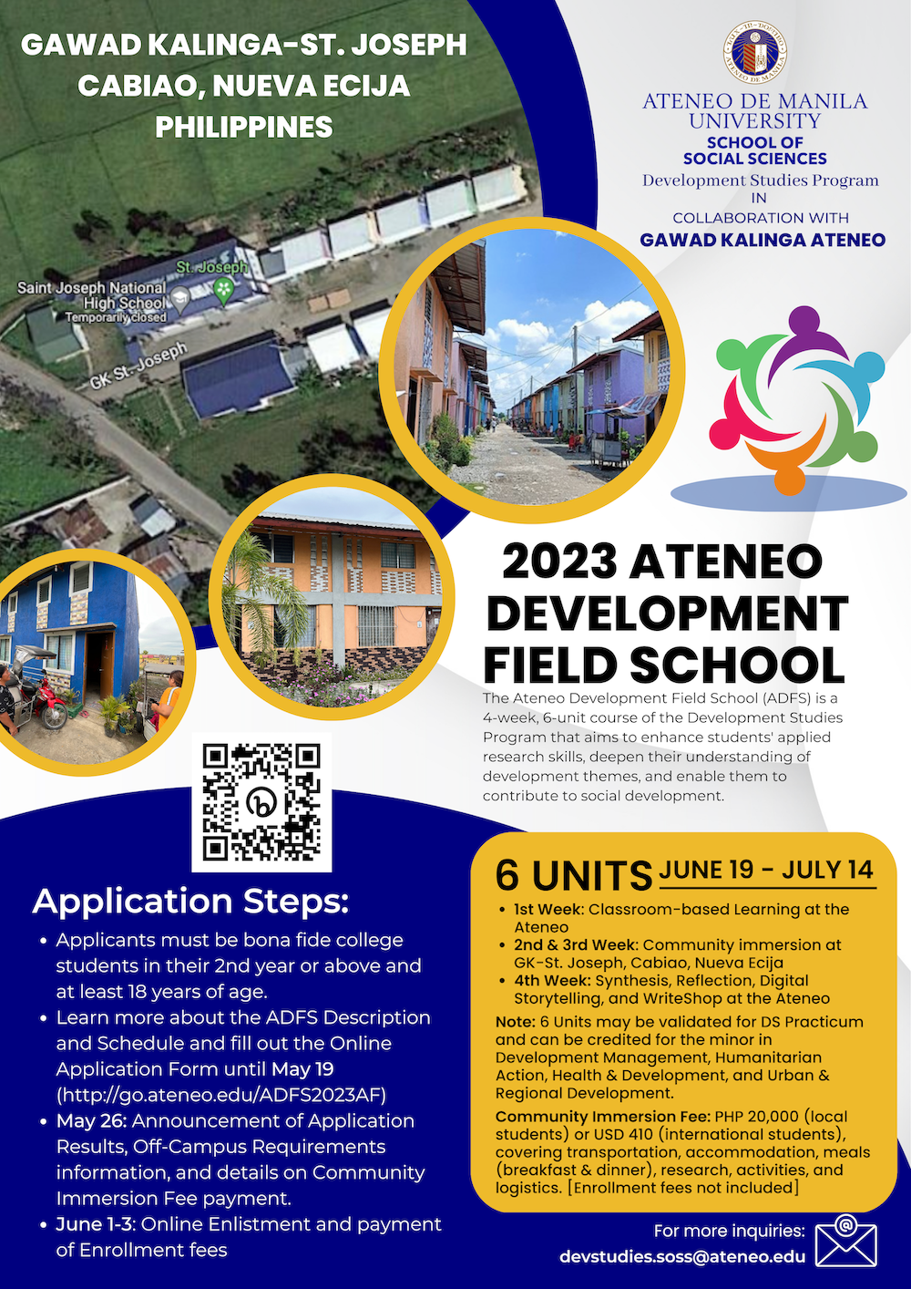 Passionate about rural development? ADFS 2023 invites college students (2nd year or above, 18+) to participate in a transformative 4-week, a 6-unit course in partnership with Gawad Kalinga Ateneo and Gawad Kalinga-St. Joseph community in Cabiao, Nueva Ecija, Philippines.