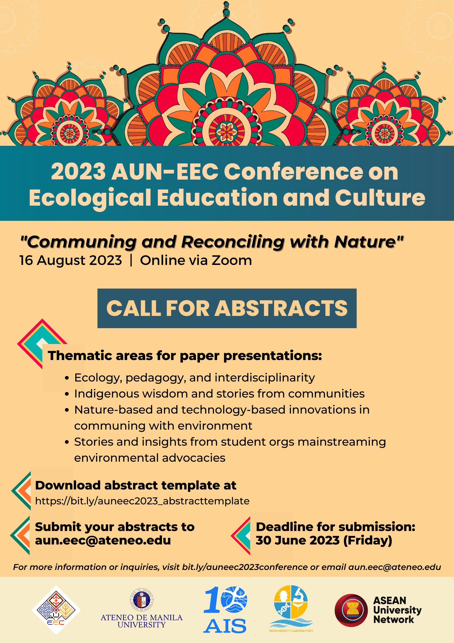 The ASEAN University Network on Ecological Education and Culture (AUN-EEC), housed at the Ateneo Institute of Sustainability, is organizing its fourth annual AUN-EEC Conference on Ecological Education and Culture. Co-organized by the Ateneo Institute of Sustainability and the Ateneo Biodiversity Research Laboratory, the conference for the year 2023 has the theme “Communing and Reconciling with Nature”, which alludes to the call for ecosystem restoration and reconciliation which might have taken the backseat during the peak of the pandemic.