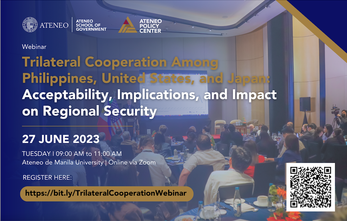 The Ateneo School of Government, through the Ateneo Policy Center, will hold a webinar on the topic, “Trilateral Cooperation Among Philippines, United States, and Japan: Acceptability, Implications, and Impact on Regional Security” on 27 June 2023.