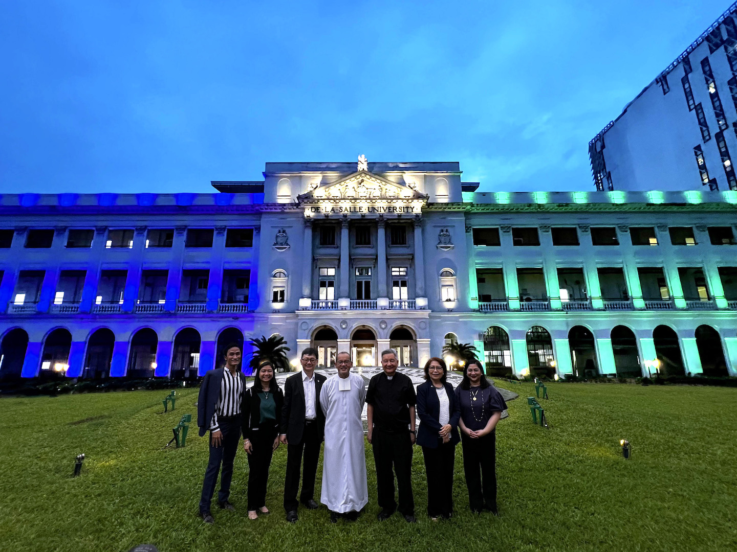 Standing before the iconic De La Salle building lit up in the colors of both schools. Left to right: Dr Norby R Salonga; Ms Fritzie Ian P De Vera; Dr Robert Roleda; Brother Bernard S Oca, FSC; Fr Roberto Yap, SJ; Dr Maria Luz Viches; Ms Ana Marina Tan