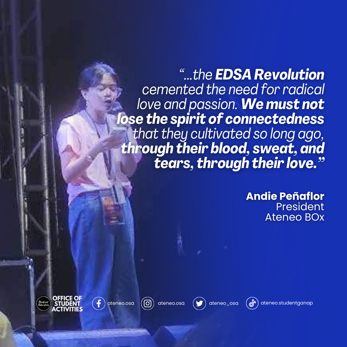Standing here with more than a thousand people, hearts connected, and directed for our love for music and for the environment, shakes my core. Just like then, and like many of our titas and titos, lolas and lolos in 1986, the EDSA Revolution cemented the need for radical love and passion. We must not lose the spirit of connectedness that they cultivated so long ago, through their blood, sweat, and tears, through their love.