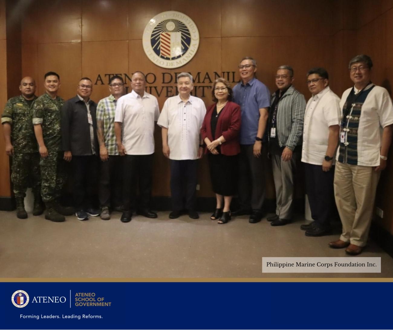 Present at the signing were LTGEN Juancho M Sabban AFP (RET), President of the Philippine Marine Corps Foundation Inc.; FR. Roberto C Yap SJ, President of Ateneo de Manila University; Maria Luz C Vilches PhD, Vice President for Higher Education at Ateneo de Manila University; Philip Arnold P Tuaño PhD, Dean of the Ateneo School of Government; Javier R Jimenez, Program Head of the Academic Program of the Ateneo School of Government; RAdm Rommel Jude G Ong (RET), Professor of Praxis at the Ateneo School of Government; and Dr Kenneth Hartigan-Go, Core Faculty of the Ateneo School of Government.