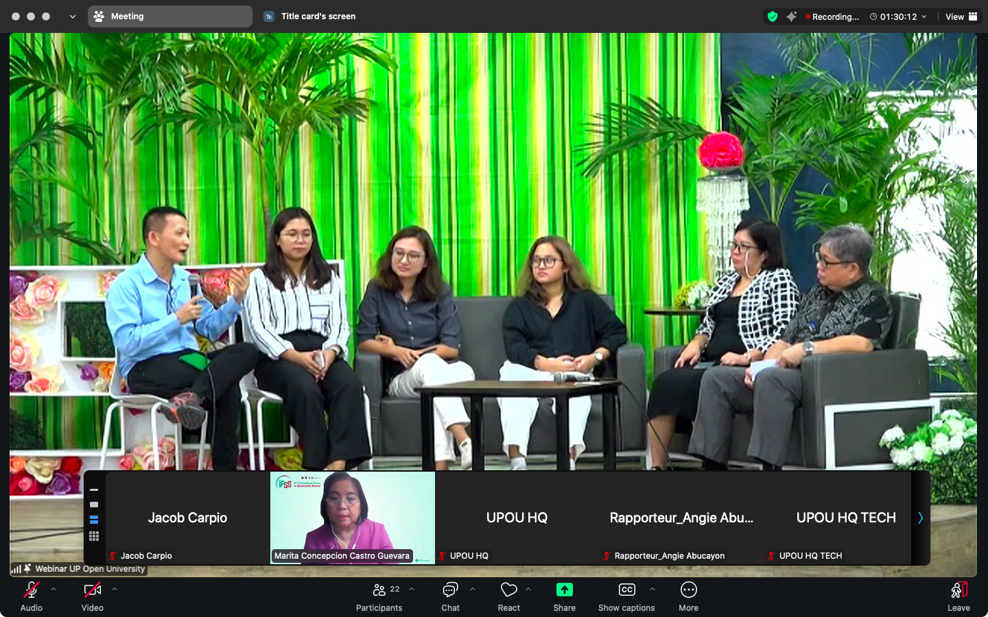 During the open forum, Dr. Batangan and Dr. Castro Guevara, alongside co-panelists Dr. Joane V. Serrano, Ms. Sydney Rovin D. Macahiya, Ms. Dina Mae N. Rejano, and Ms. Janelle G. Ebron, discussed the challenges of bringing micro-credentials to the country given the complexities of the socio-economic and educational situation. With the advent of rapid technological adoption, internet connectivity, low network bandwidth, and the high cost of acquiring mobile data in the country serves as a significant issue that may impede learners’ experience of education. This is why, according to Dr. Castro-Guevara, online courses such as those offered under MICROCASA must support low resolution files and be interoperable across different portable devices, including smartphones. Despite this, a notable interest and demand for online courses remains, in light of the total count of learners taking online courses at UPOU reaching over 11,000, as remarked by Dr. Batangan.