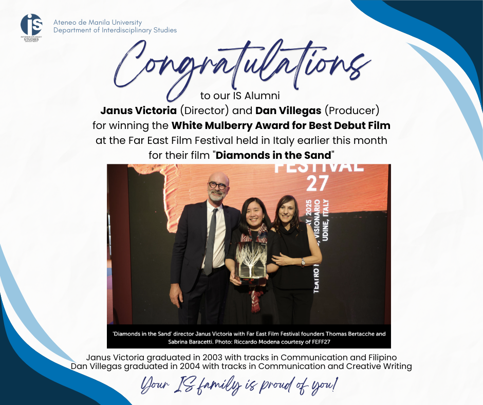 Congratulations to our IS Alumni Janus Victoria (Director) and Dan Villegas (Producer) for winning the White Mulberry Award for Best Debut Film at the Far East Film Festival held in Italy earlier this month for their film "Diamonds in the Sand"