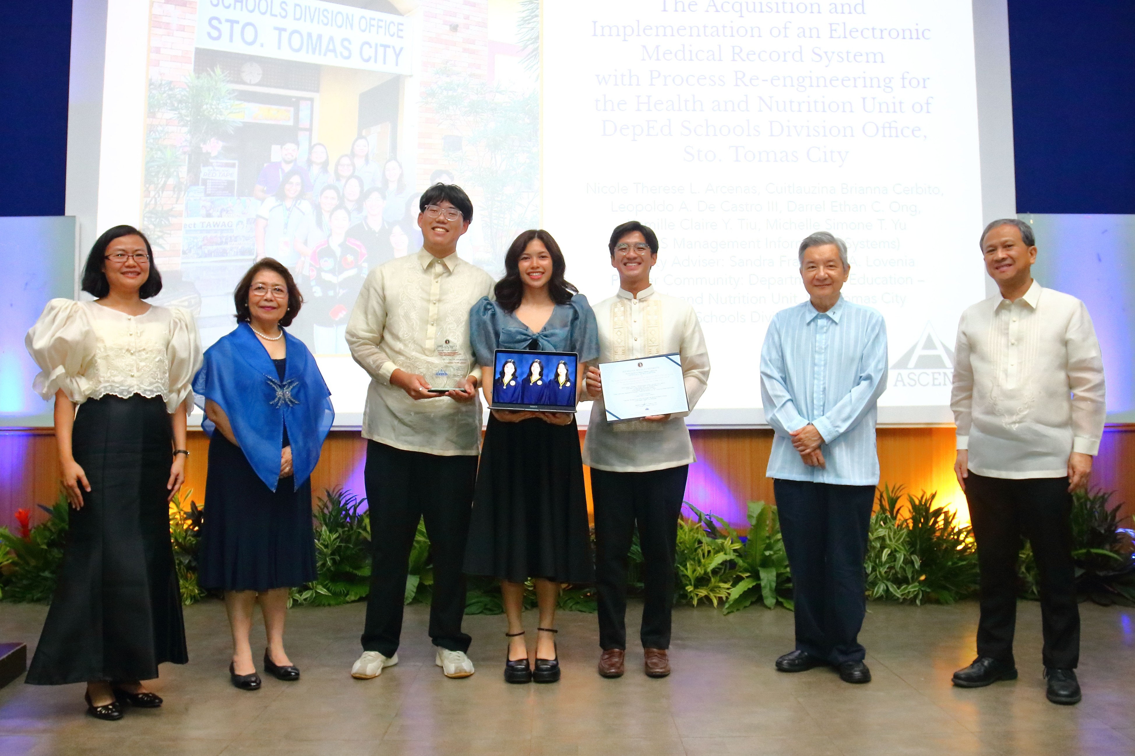 This year’s ASCEND Excellence Award for College Thesis Project was awarded to fourth year BS Management Information Systems students, Nicole Therese L. Arcenas, Cuitlauzina Brianna Cerbito, Leopoldo A De Castro III, Darrel Ethan C Ong, Kamille Claire Y Tiu, and Michelle Simone T Yu, for their research entitled, “The Acquisition and Implementation of an Electronic Medical Record System with Process Re-Engineering for the Health and Nutrition Unit of DepEd Schools Division Office, Sto Tomas City”.